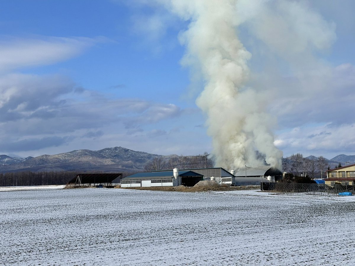 正午前、上士幌町東6線付近で建物火災が発生し、消防車が出動しております。銀色の工場付近から黒煙が立ち上っているように見えるのですが、被害が心配です。 t.co/05QY7H9KmT