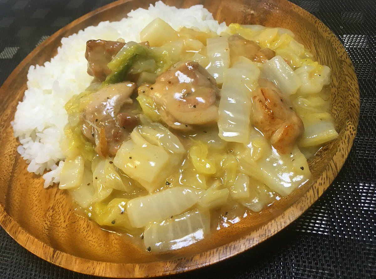 鶏モモ200gを胡椒とバター15gで炒め取り出し、白菜250g入れ肉と日本酒大6入れ蓋し20分、シチュールー2片入れ溶かし完成