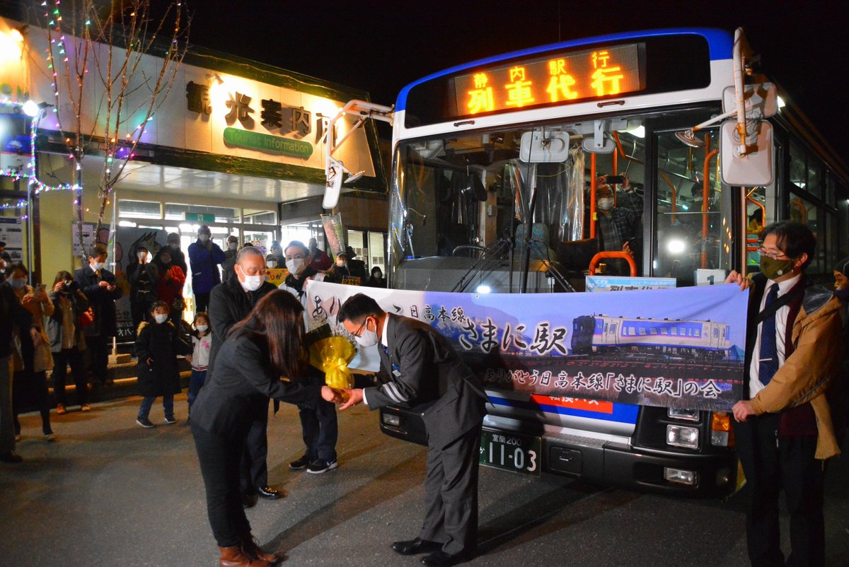 様似駅前ではセレモニーが開催され、様似町長の送辞や最終代行バスの運転手へ花束贈呈が行われました。 https://t.co/9EZuoabGin