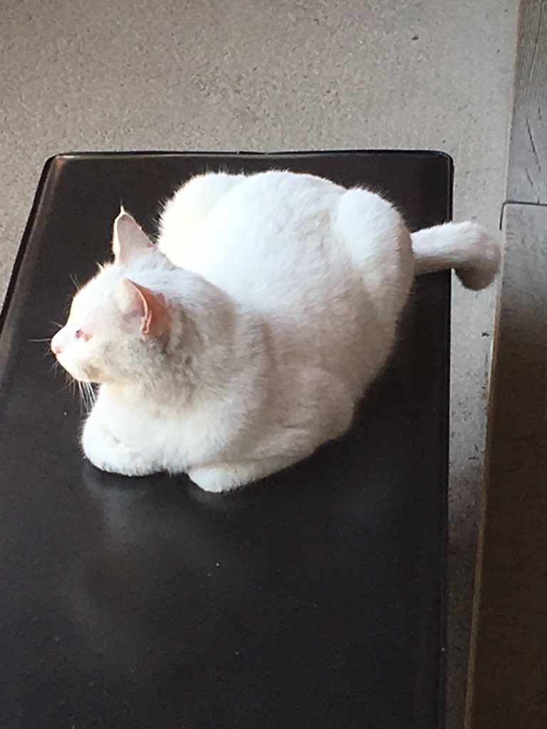 久しぶりに大学付近の神社に行ってベンチに座ったらデカイ白猫出現。