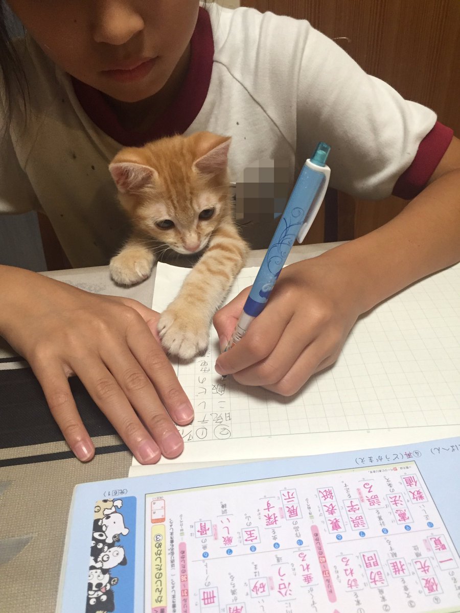 本や新聞などを読んでいたり、ノートを広げての勉強中、さらにはパソコンで仕事中など 、一人で何かに集中している時を狙いすまして邪魔しにやって来る。