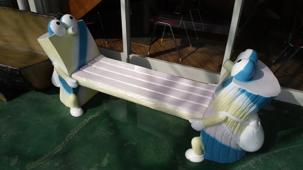 かわいらしい河童がデザインされたベンチだが、よく見ると2匹の河童が正座して座面を支えている…。