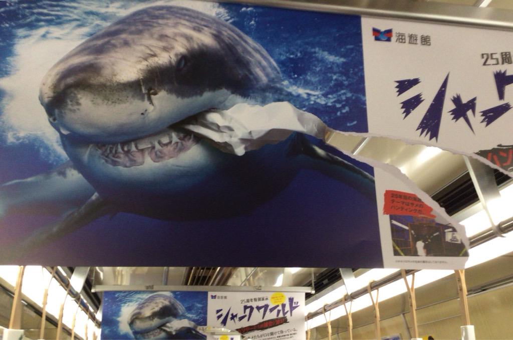 誰が電車の中吊り広告破ったんだよ!ってよくよく見たら…犯人は鮫かよ! https://t.co/UF9xC4YZLi