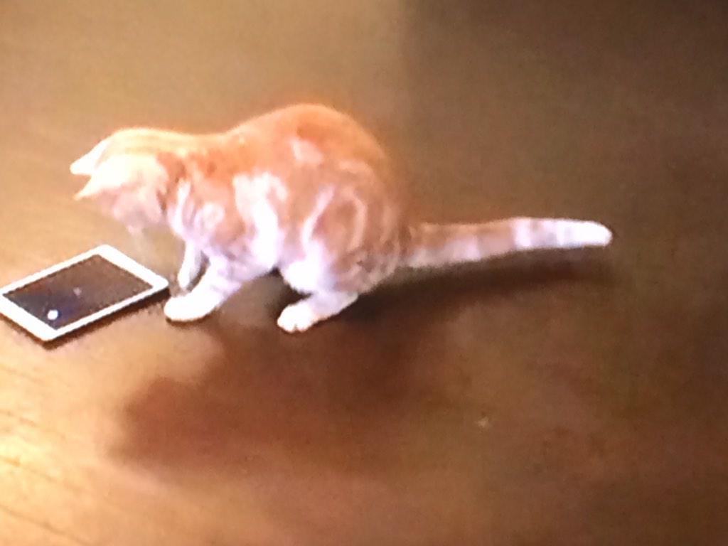 アプリを起動して撮影モードにした後は、iPhoneやiPadを猫ちゃんの近くにそっと置いてみましょう。猫ちゃんが画面の動きに反応して、手を伸ばして触ったらもう撮影完了です