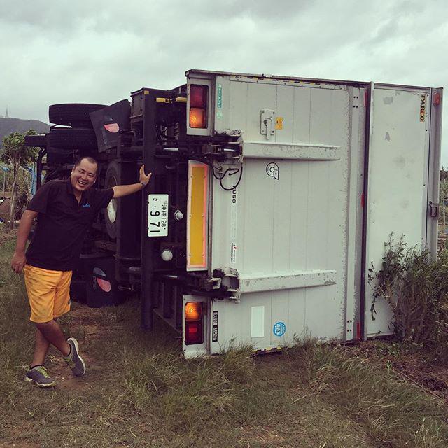 石垣島在住の人気Vineユーザー、根間タダシさんによると、この台風の影響で彼の父親が所有する4トントラックが横倒しになってしまった。