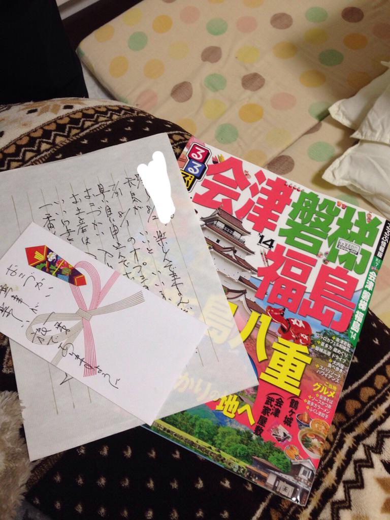 会津地方などの福島県のガイドブックとともに「おこづかい」と書かれた封筒と、達筆な文字で書かれた手紙が写っている。手紙だけならまだしも、おこづかいまで挟まっていたため、投稿主の父親が購入した古本屋へ聞きに行くことにしたそうだ。