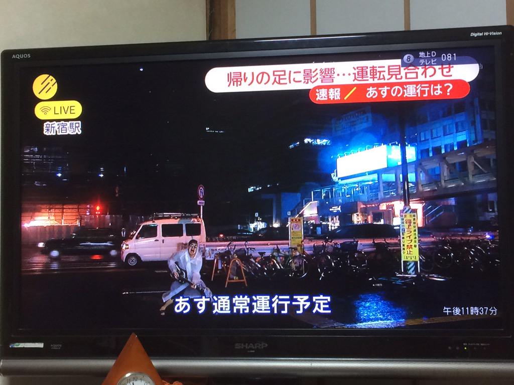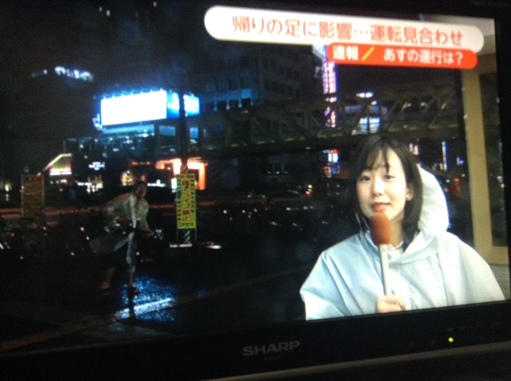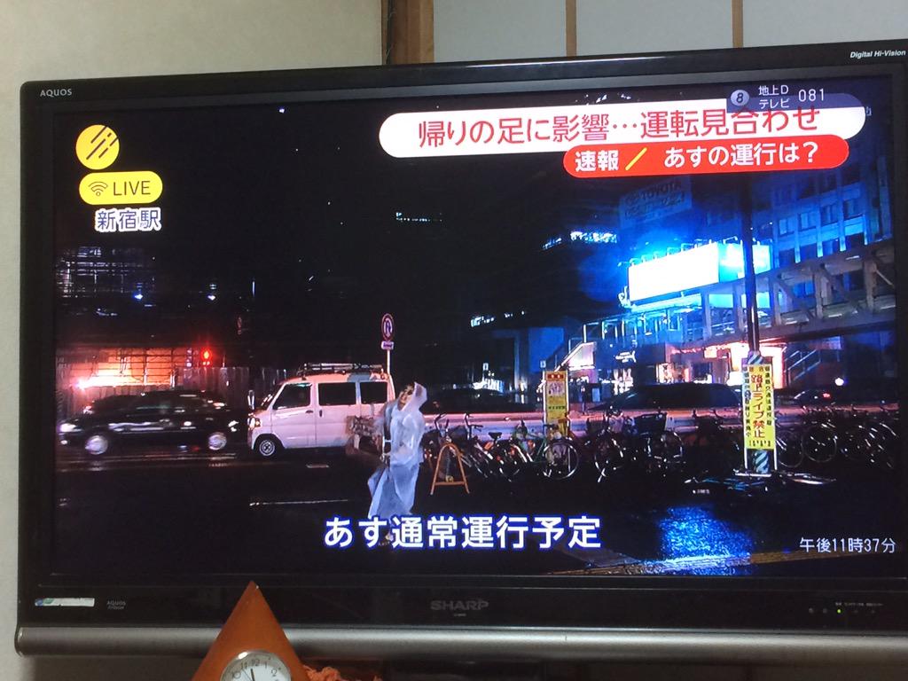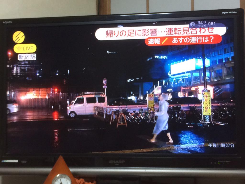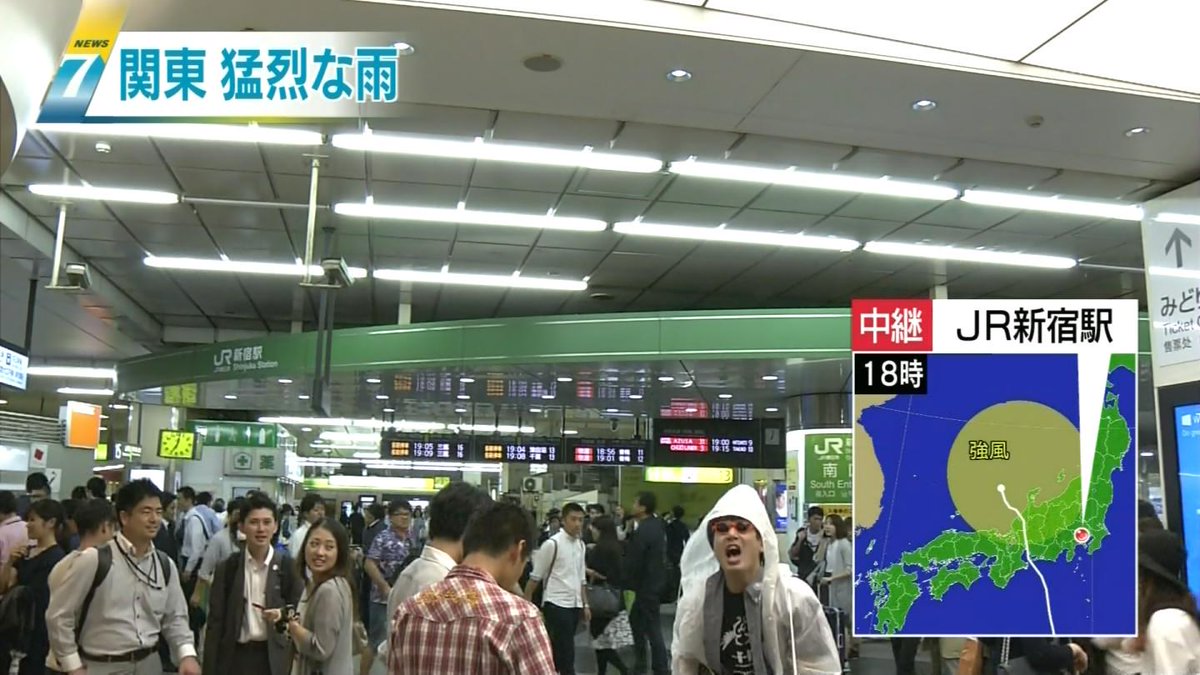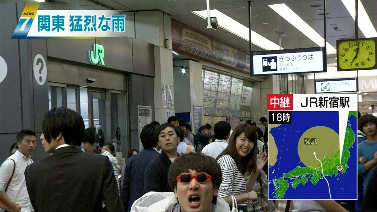 フジテレビの新宿駅からの台風中継。