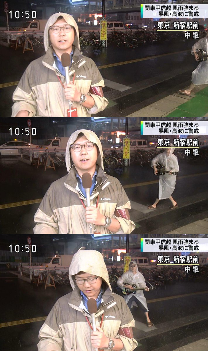ニュースで台風中継を渋谷でしていたんだけど、路上ミュージシャンが、ギター片手に熱唱しながら何度もフレームインしてきた。