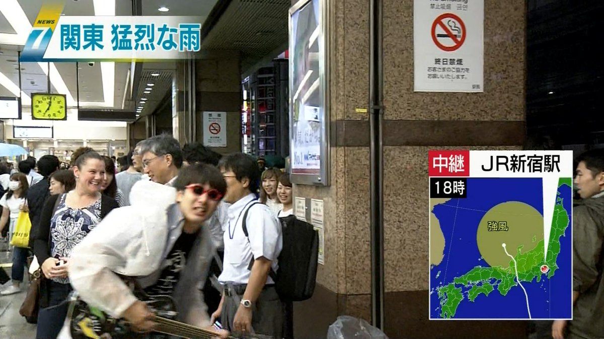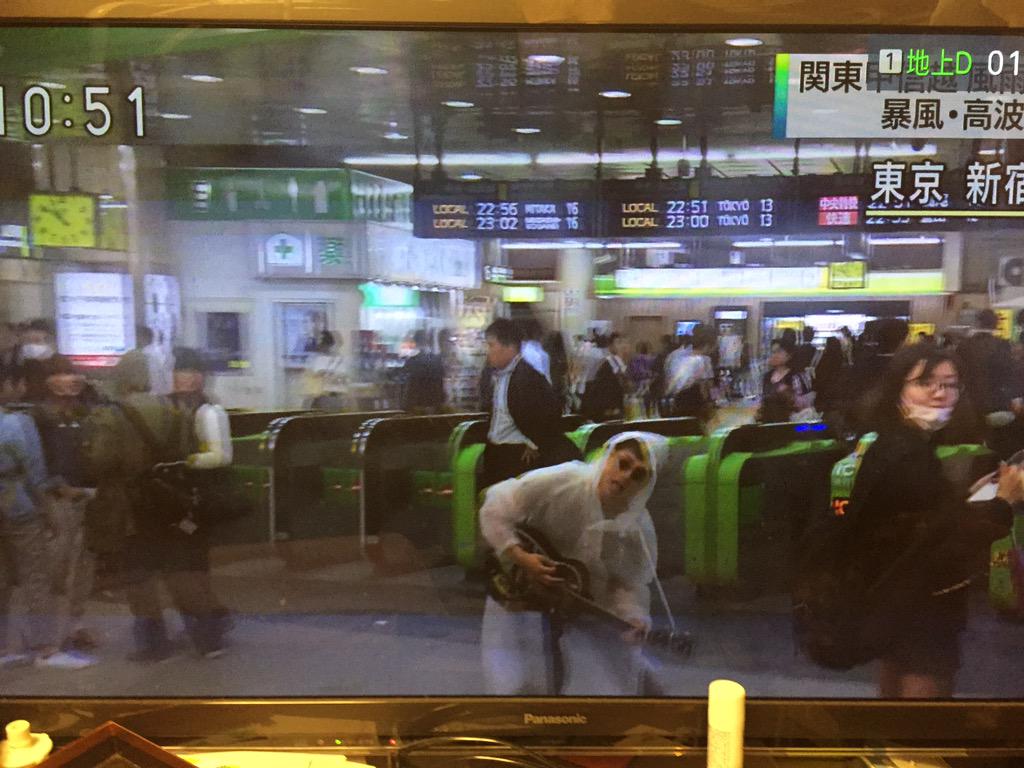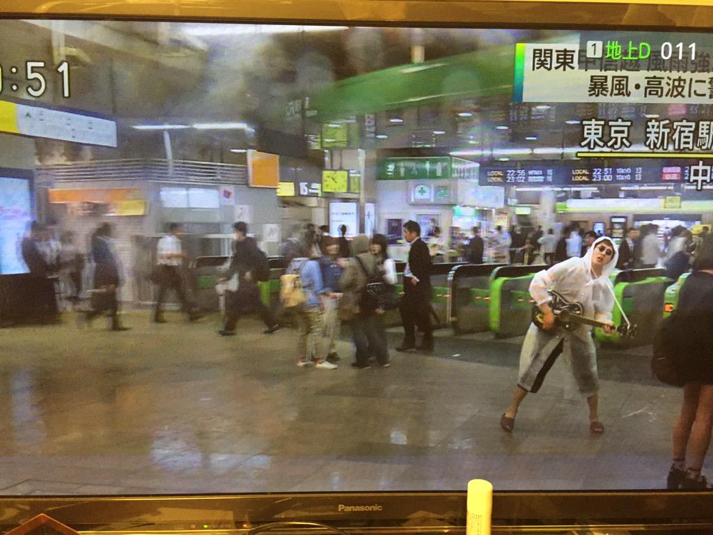 なんか今ニュースで新宿駅が映ってて台風について電車が遅れてます〜的な事を言ってる後ろにカッパ着てギター弾いてる人写って爆笑した w ww w 何してんだ w w w 雨の中カッパ着てギター🎸w w w w http://t.co/FeBxo1erIo