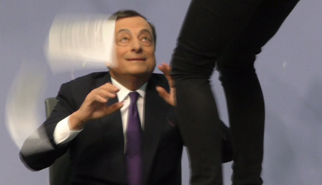 女は記者会見の開始直後、ドラギ総裁の前に置かれたテーブルに飛び乗り、「ECBの独裁をやめろ」などと叫びながら紙や紙吹雪をまき散らした。