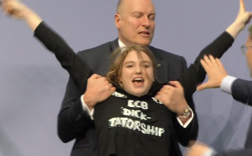 ◆欧州中央銀行の会見に、若い女性が乱入!