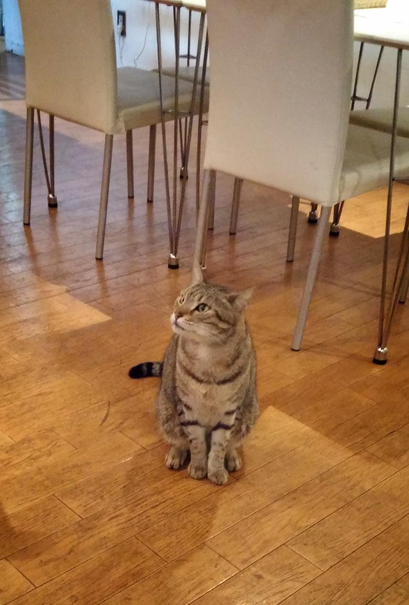 最初から首輪を付けていた野良猫(迷い猫?)です。ポスターを貼るなどして飼い主を探しましたが結局現れず、近所の床屋さん周辺に居着いて看板猫やってます(笑)床屋の椅子で大あくび。 http://t.co/uX5Y9G3Pfc