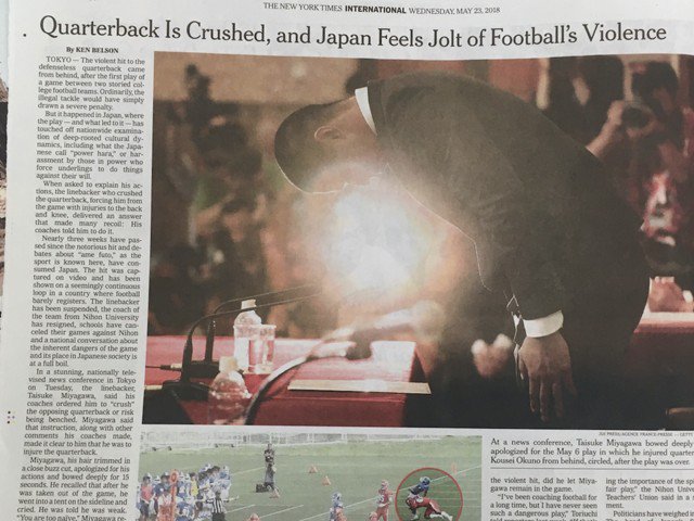 6日に行われたアメリカンフットボールの関学大と日大との定期戦で、関学大の先発出場したクォーターバック(QB)選手が相手守備選手から悪質なタックルを受け、負傷した問題が波紋を広げています。